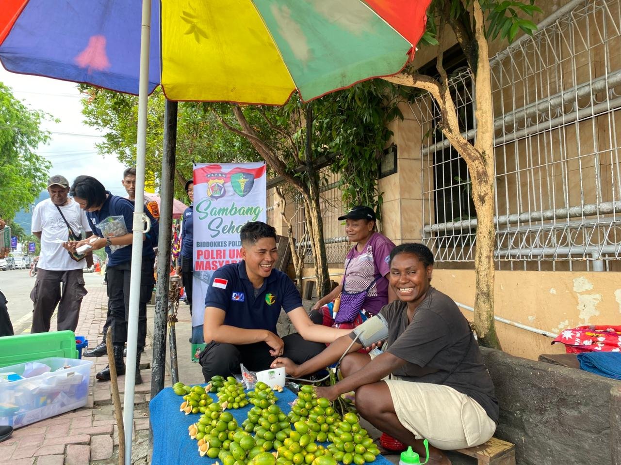 Papua – Dalam upaya meningkatka kesehatan masyarakat serta mempererat hubungan antara Polri dan warga, personel Biddokkes Polda Papua melaksanakan kegiatan Sambang Sehat kepada para mama-mama penjual pinang di depan pintu masuk Bandara Sentani, Kabupaten Jayapura, Selasa (21/10/2025).