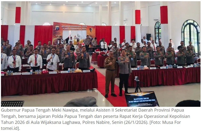 Penegasan tersebut disampaikan Gubernur Papua Tengah melalui Asisten II Sekretariat Daerah Provinsi Papua Tengah saat menghadiri Rapat Kerja Operasional Kepolisian Tahun 2026 yang digelar di Aula Wijaksana Laghawa, Polres Nabire, Senin (26/1/2026).