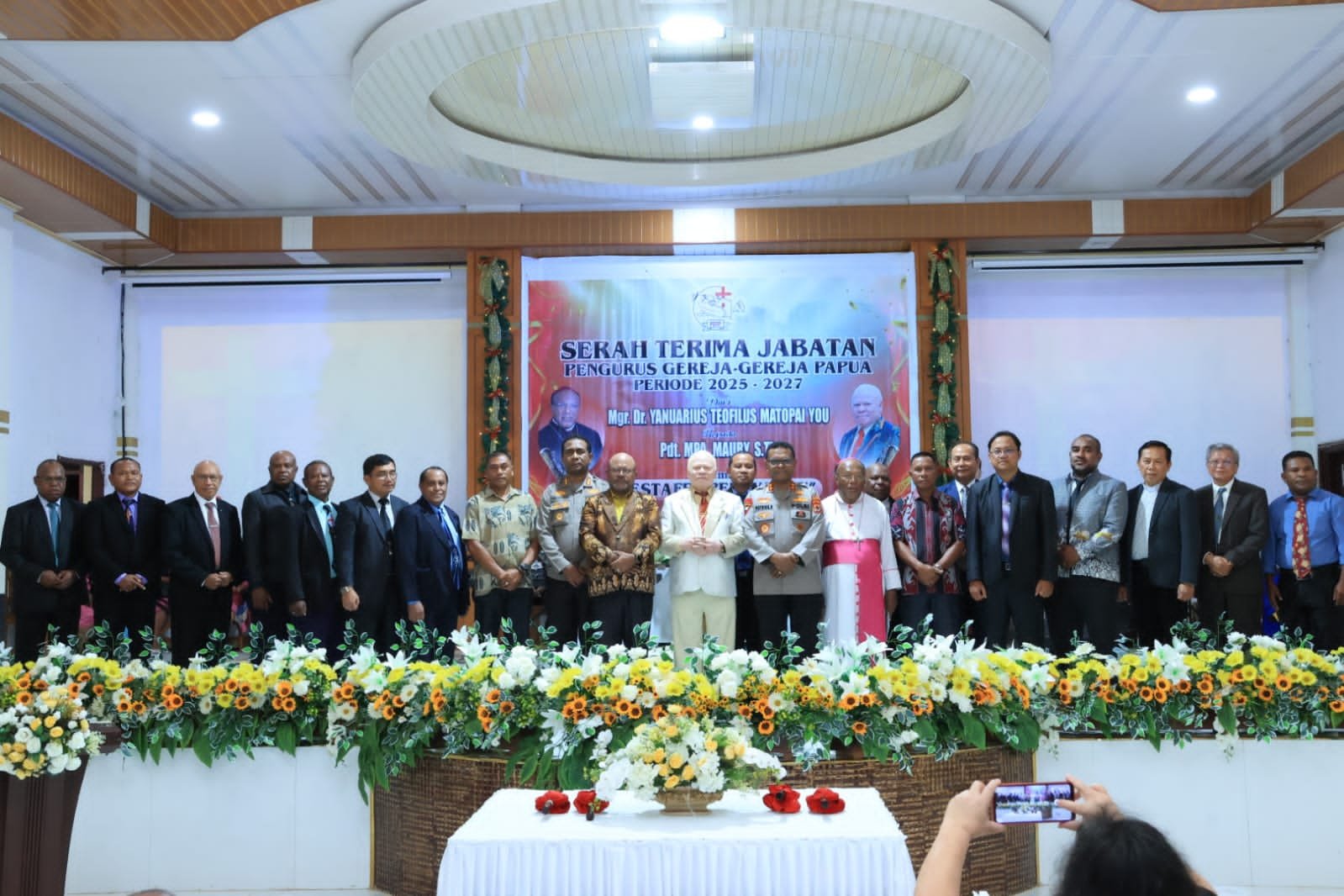 Kegiatan tersebut turut dihadiri oleh Kapolresta Jayapura Kota Kombes Pol. Fredrickus W. A. Maclarimboen, S.I.K., M.H., CPHR, Kajasdam XVII/Cenderawasih Kolonel Inf. Dominggus Lopes, S.Sos, Ketua Umum PGGP yang lama Mgr. Yanuarius Teofilus Matopai You, serta Ketua PGGP yang baru dilantik Pdt. M.P.A. Maury, S.Th, bersama para tokoh gereja dan jemaat yang hadir dalam suasana penuh hikmat dan kebersamaan.