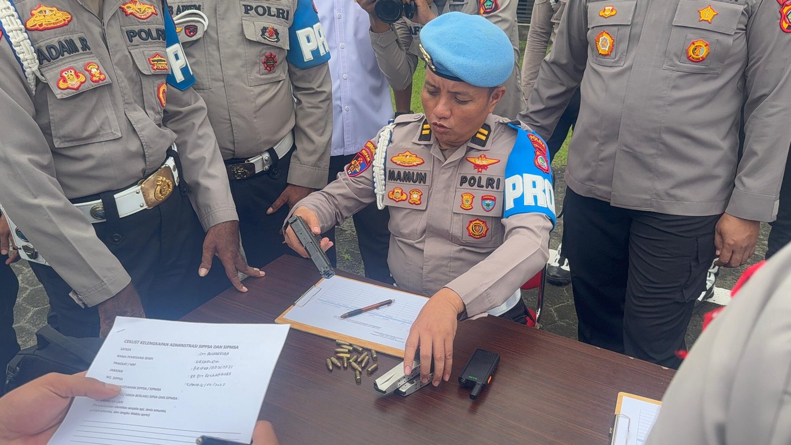 Pemeriksaan dilakukan secara menyeluruh dan teliti, meliputi aspek amunisi, kebersihan senjata, kondisi fisik senjata api, serta kelengkapan surat tanda pemegang senjata api beserta masa berlaku izinnya.