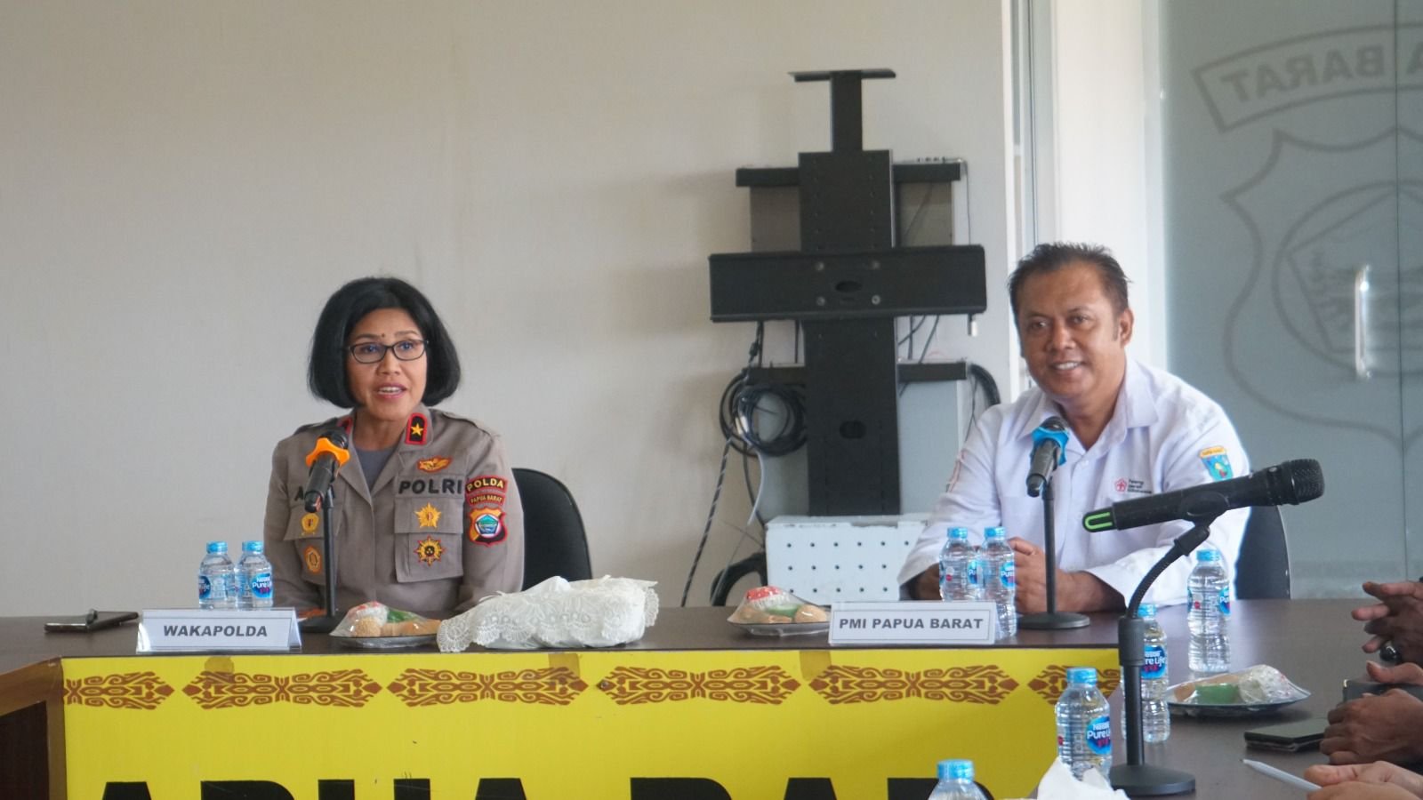Dalam kunjungan tersebut, rombongan PMI Provinsi Papua Barat dan Dinas Kesehatan Provinsi Papua Barat disambut oleh Wakapolda Papua Barat Brigjen Pol Dr. Sulastiana, M.Si., CRGP., CHCM., CRPP., Dir Binmas Polda Papua Barat Kombes Pol Hari S. Sembiring, S.I.K. di Ruang Vicon.