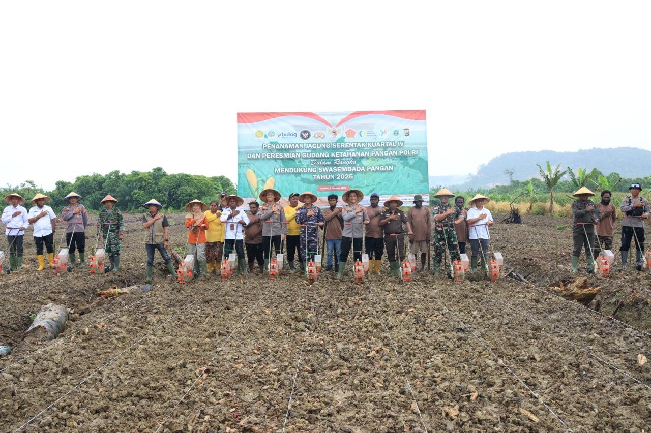 Papua – Polda Papua melalui jajaran melaksanakan kegiatan Penanaman Jagung Serentak Kuartal IV dan Peresmian Operasional Gudang Penyimpanan Jagung Slog Polri sebagai bagian dari program nasional Swasembada Pangan Tahun 2025, bertempat di lahan PTPN, Jalan Poros Arso 6 – Arso 1, Kampung Sanggaria, Kabupaten Keerom, Rabu (08/10).