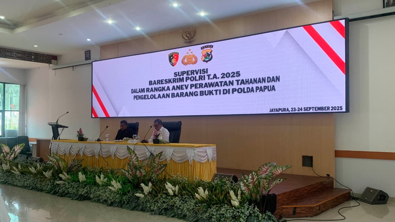 Papua – Kepolisian Daerah Papua menerima supervisi dari Tim Bareskrim Polri Tahun Anggaran 2025 dalam rangka Analisa dan Evaluasi (Anev) Perawatan Tahanan dan Pengelolaan Barang Bukti. Kegiatan tersebut berlangsung di Aula Rastra Samara Mapolda Papua, Rabu (24/09).