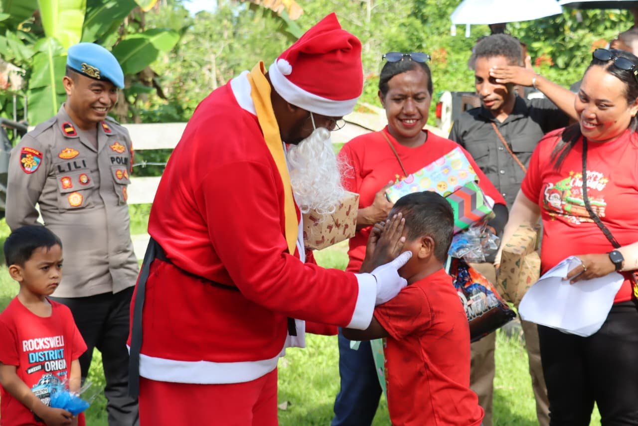 “Hari ini kami bersama Bhayangkari mengunjungi masyarakat, khususnya anak-anak, untuk ikut memeriahkan dan menyambut Hari Natal. Kami mengimbau seluruh masyarakat untuk menjaga kamtibmas agar perayaan Natal dan Tahun Baru dapat berlangsung hikmat, damai, dan penuh sukacita. Semoga kita menyambut tahun yang baru dengan hati gembira,” ujarnya.