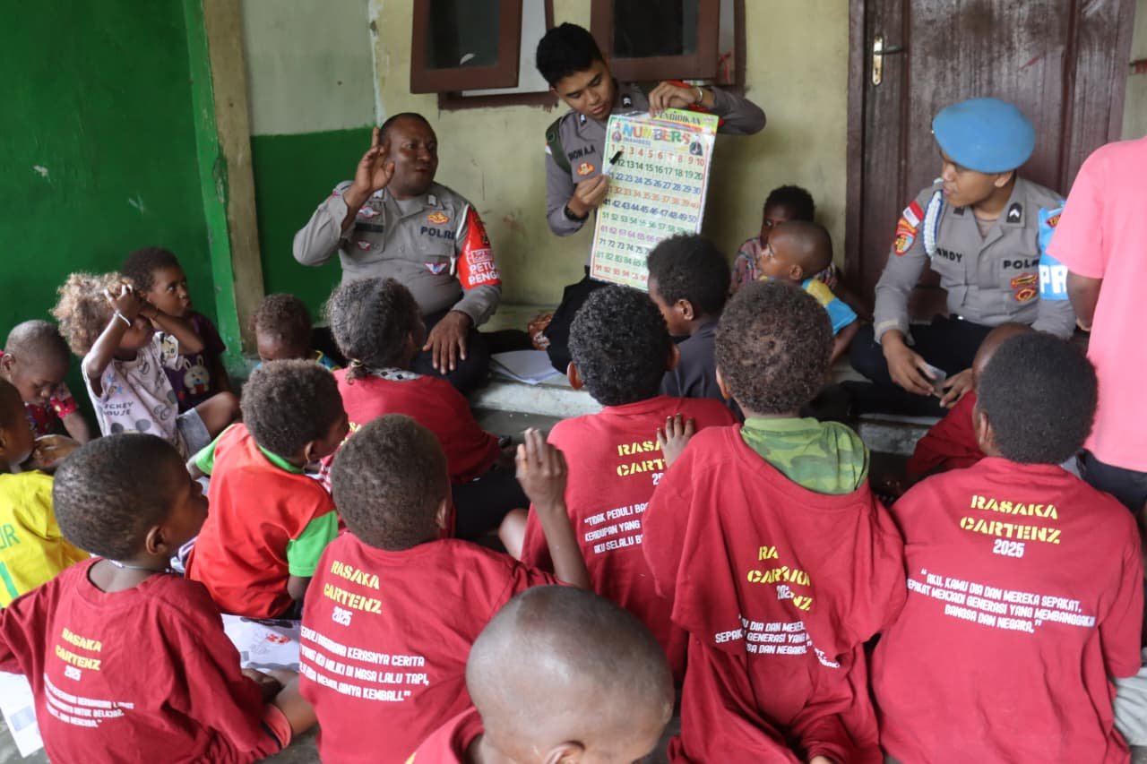 Papua – Polri terus berkomitmen meningkatkan kualitas pendidikan yang rutin dilaksanakan melalui Program Polisi Pi Ajar. Hal inilah yang dilakukan jajaran anggota Polisi di Kabupaten Yahukimo, Papua Pegunungan dengan mengajarkan anak-anak binaannya di jalan Sosial Distrik Dekai Kabupaten Yahukimo, Selasa (9/9/25).