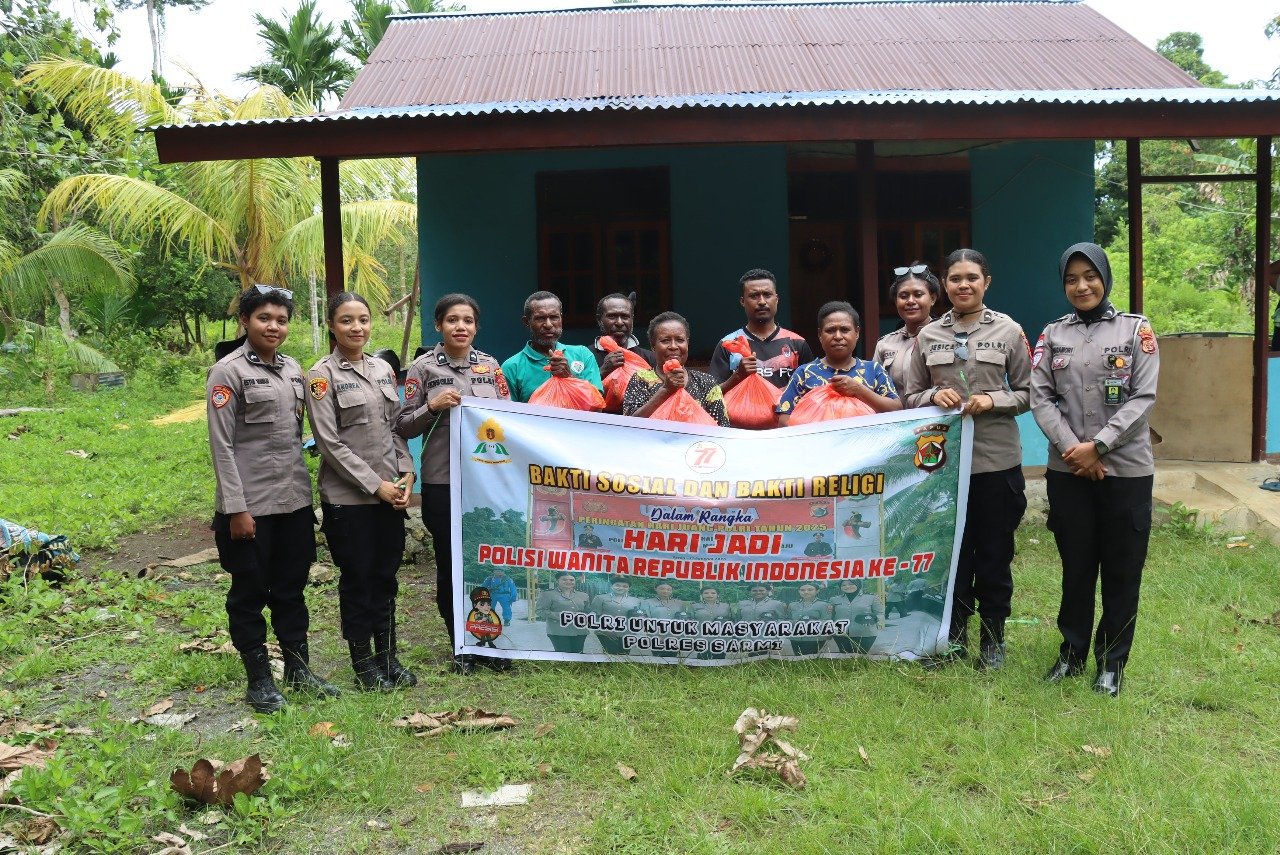 Papua – Dalam rangka memperingati Hari Jadi Polisi Wanita (Polwan) ke-77 tahun 2025, Polwan Polres Sarmi melaksanakan kegiatan bakti sosial dengan membagikan paket sembako kepada warga masyarakat di Kampung Tafarewar, Kampung Tanjung Batu, dan Kampung Vietnam, Kabupaten Sarmi, Minggu (31/8/25).