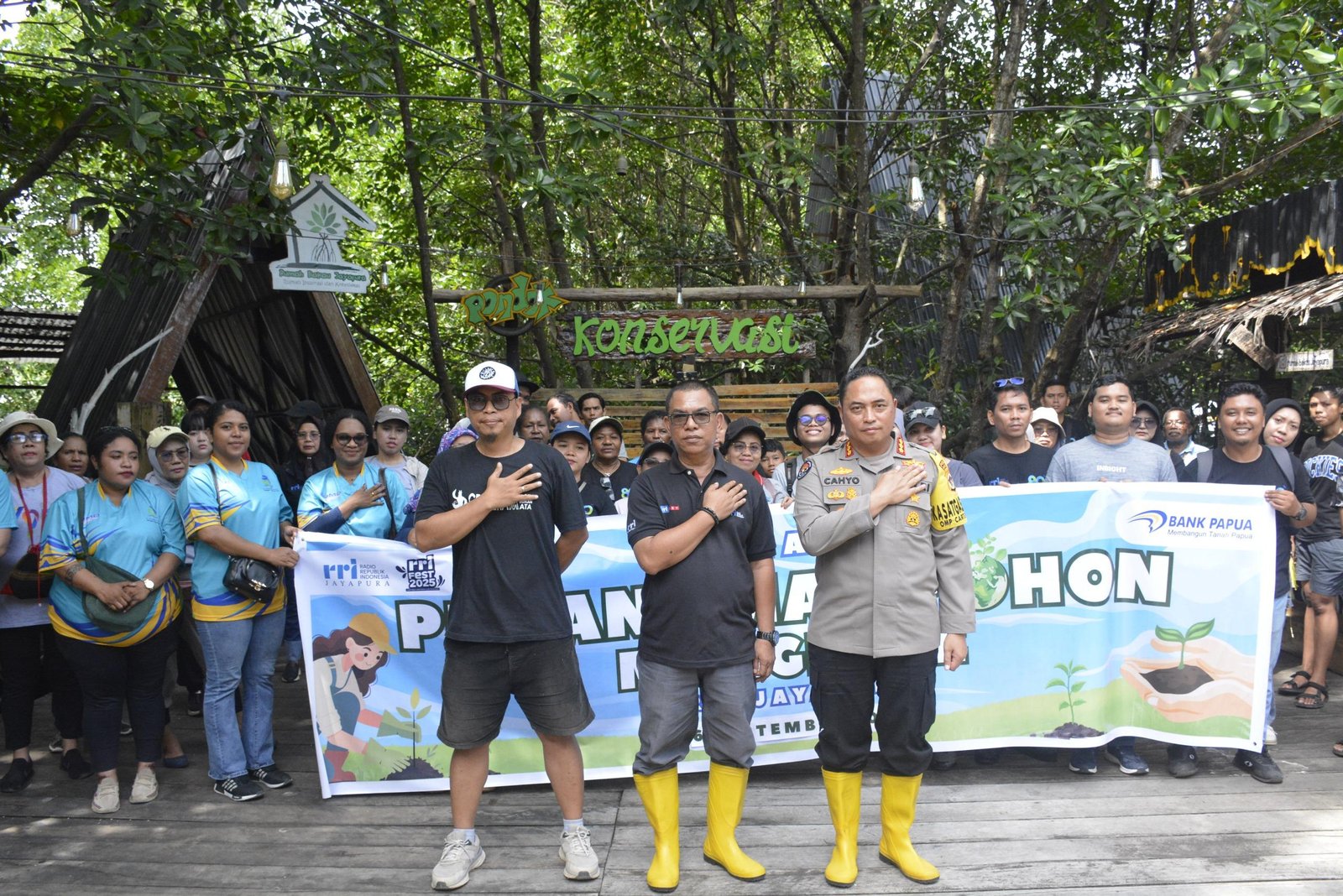 Puncak kegiatan ditandai dengan aksi penanaman pohon mangrove oleh Kabid Humas Polda Papua bersama Kepala Stasiun RRI Jayapura.