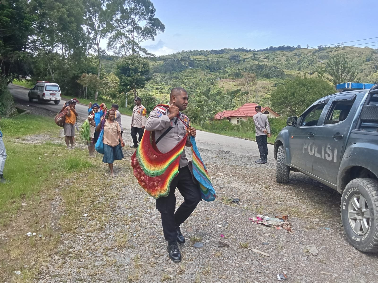 Saat melaksanakan patroli dialogis, personel Sat Binmas bertemu dengan rombongan mama-mama Papua dari beberapa kampung dan distrik yang hendak menuju pasar untuk menjual hasil kebun berupa sayur-sayuran dan umbi-umbian. Melihat kondisi tersebut, petugas dengan sigap memberikan bantuan dengan mengangkat dan mengantarkan barang dagangan milik Ibu Yeminca Weya menggunakan kendaraan patroli menuju Pasar Lokal Karubaga.