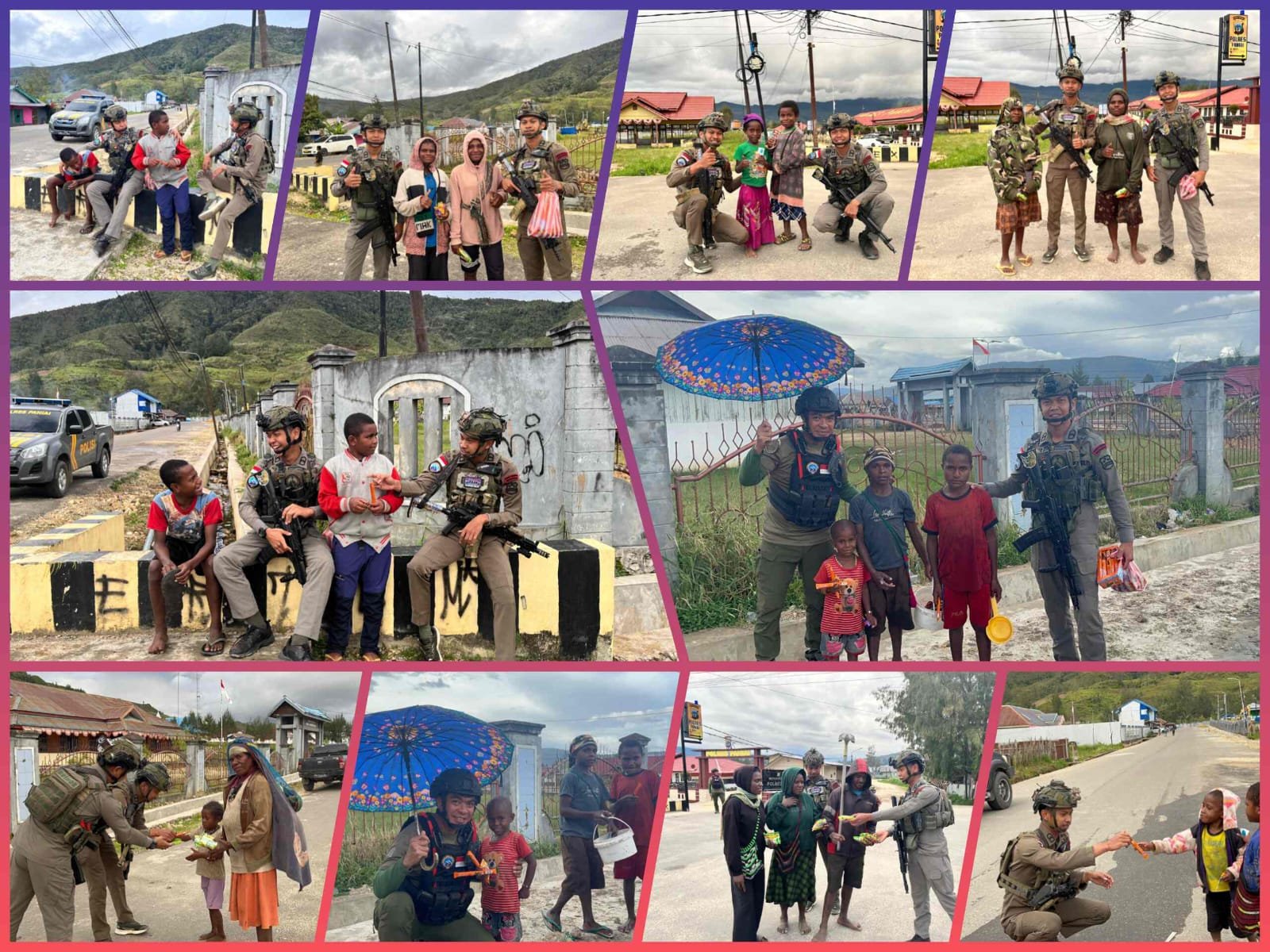 Dalam kesempatan tersebut, personel Satgas Ops Damai Cartenz menyapa masyarakat serta berbincang hangat dengan anak-anak setempat. Selain itu, mereka juga membagikan makanan ringan dan gula-gula, yang langsung disambut antusias oleh anak-anak di sepanjang kegiatan.