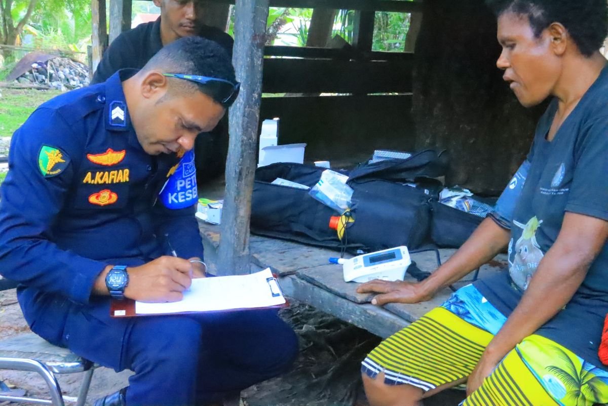 Petugas kesehatan Subsatgas Keladi Sagu turun langsung ke kampung-kampung, memberikan pemeriksaan kesehatan, penimbangan berat badan, serta pemberian vitamin dan obat-obatan dasar bagi balita dan ibu hamil.