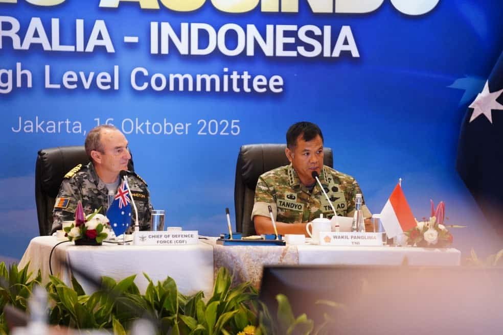 Jakarta – Wakil Panglima Tentara Nasional Indonesia (TNI) Jenderal TNI Tandyo Budi Revita mewakili Panglima TNI Jenderal TNI Agus Subiyanto bersama Panglima Angkatan Bersenjata Australia Laksamana David Johnston AC RAN., memimpin sidang ke-13 Australia – Indonesia (AUSINDO) High Level Committee (HLC), bertempat di ruang konferensi, hotel Ritz-Carlton, Kuningan, Jakarta. Kamis (16/10/2025).